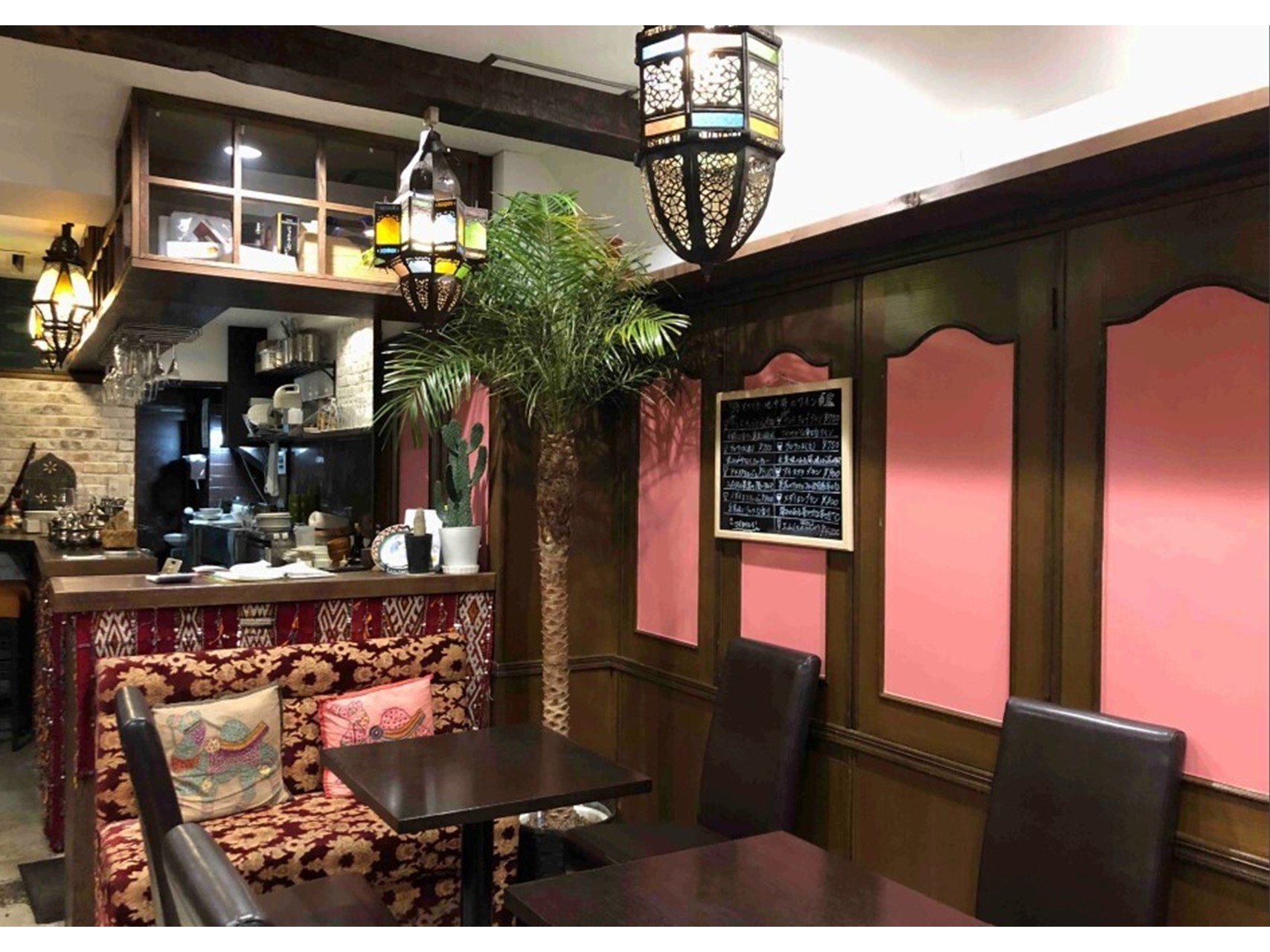 内装は、ダークブラウンで統一されたテーブルと椅子が配置され、壁際にはエキゾチックな柄のソファ席もございます♪