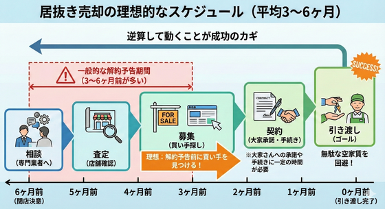 理想的なのは、閉店を決意した段階ですぐに専門業者へ相談し、解約予告を出す前に次の入居者(買い手)を見つけることです。これにより、無駄な家賃の支払いを防ぎ、スムーズな引き渡しが可能になります。「逆算して動くこと」が、居抜き売却成功のカギと言えるでしょう。